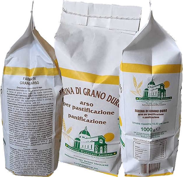 La farina di grano arso è ottenuta dalla macinatura di grano duro precedentemente tostato. Fino a pochi decenni fà si otteneva dal grano raccolto dopo la bruciatura delle stoppie e veniva utilizzato dai contadini che non potevano permettersi la farina tradizionale. Oggi, fortemente rivalorizzata dalle preparazioni di tantissimi chef stellati, torna in auge grazie alla sua duttilità in cucina ed alla storia fatta di poveri contadini e di antichissime tradizioni gastronomiche. Un prodotto in grado di raccontare la storia e le tradizioni di un intero territorio (il meridione d'Italia). Si presenta di color grigio cenere ed un aroma intenso che ricorda il caffè appena tostato. La farina di grano arso va utilizzata nella misura di 1:3 sul totale della farina. Può essere usata per la preparazione di pasta, focacce, pane ed altri lievitati.