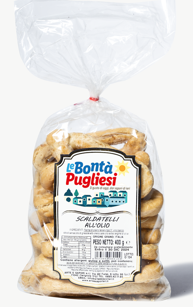 Farina di grano tenero tipo “0”, vino bianco, olio di sansa, sale, olio extravergine di oliva 2,5%