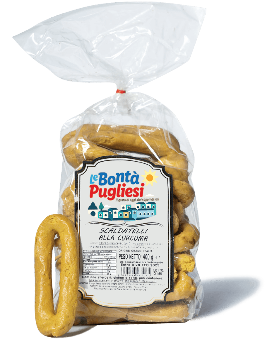 Farina di grano tenero tipo “0”, vino bianco, olio di sansa, olio di girasole altoleico, sale, curcuma (0,4%), olio extra vergine di oliva.