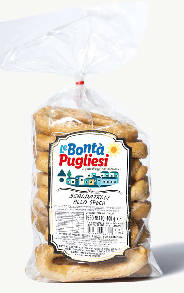 Farina di grano tenero tipo “0”, vino bianco, olio di sansa, sale, olio extravergine di oliva 2,5%, speck 3%