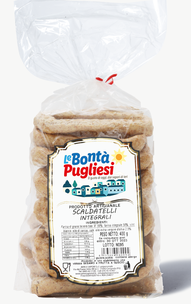 Farina di grano tenero tipo “0” 50%, farina integrale 50%, vino bianco, olio di sansa, sale, olio extravergine di oliva 2,5%